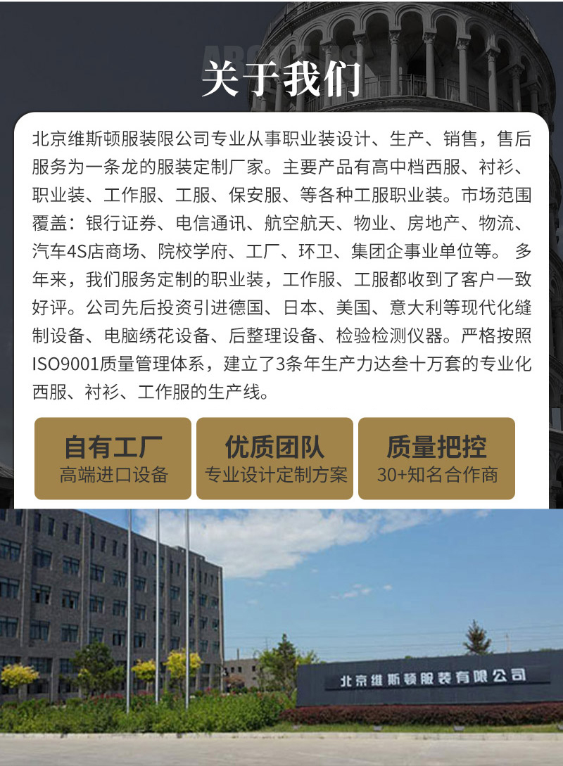 北京維斯頓服裝有限公司專業(yè)從事定制西服、職業(yè)裝、制服、工作服、工服、工裝、保安服、襯衫、夾克、西裝、商業(yè)裝、護(hù)士服、校服、保潔服、學(xué)生服、工程服、男式西服、女士西服、特體西服等。維斯頓品牌斯蒂維紳